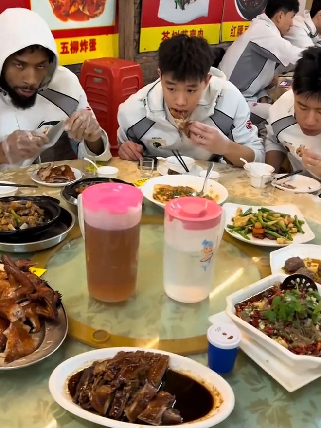 開心,同曦隊與廣東隊的比賽結(jié)束之后,前廣東隊球員,現(xiàn)同曦隊球員黃榮奇,也是做了一次地主之誼,請同曦隊球員在東莞大排檔吃飯!為此,黃榮奇也是大方一回,點了很多當時的招牌菜,讓同曦隊球員吃得開心,吃的舒心,看看鄔挺嘉吃得多爽:白切雞真好吃!